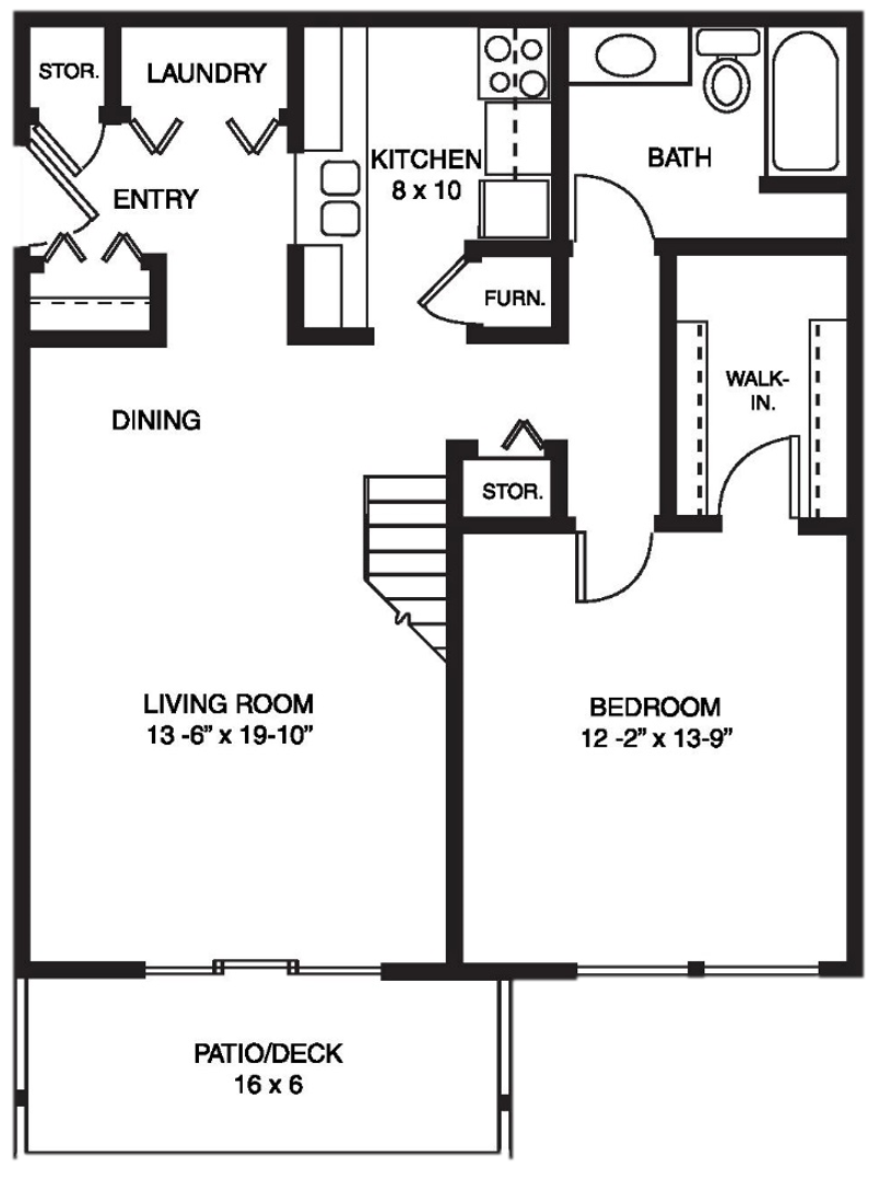This is our European Patio floorplan with one bedroom, one bathroom, and 837 square feet of living space. This floorplan offers a fully-equipped kitchen, private patio/balcony, and a washer/dryer in-unit. Please call a member of our friendly leasing staff for more information!