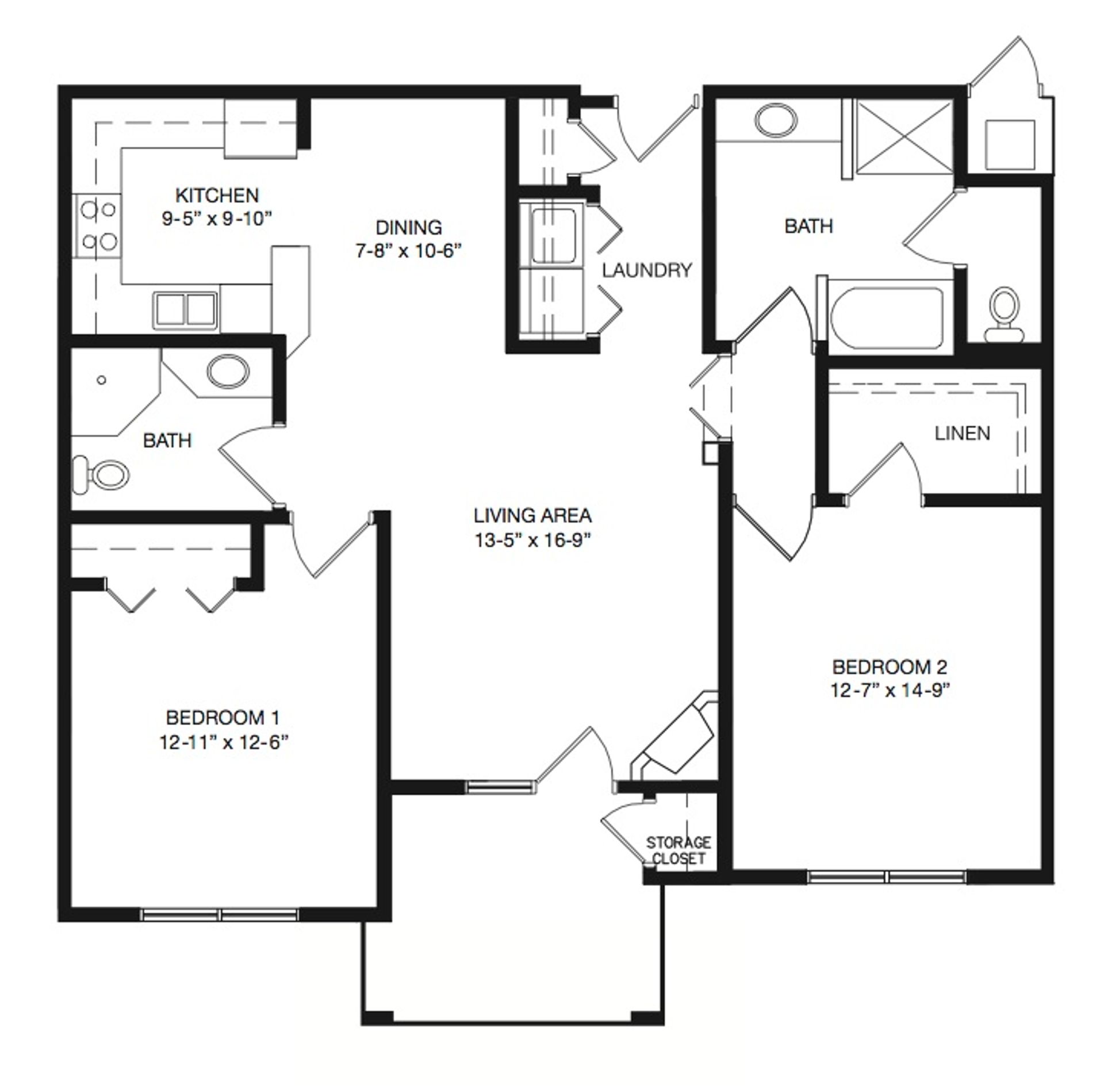 This is our Riviera floorplan with two bedrooms, two bathrooms, and 1,175 square feet of living space. This floorplan offers a fully-equipped kitchen, large walk-in closet, and a garden style-soaking tub. Please call a member of our friendly leasing staff for more information!