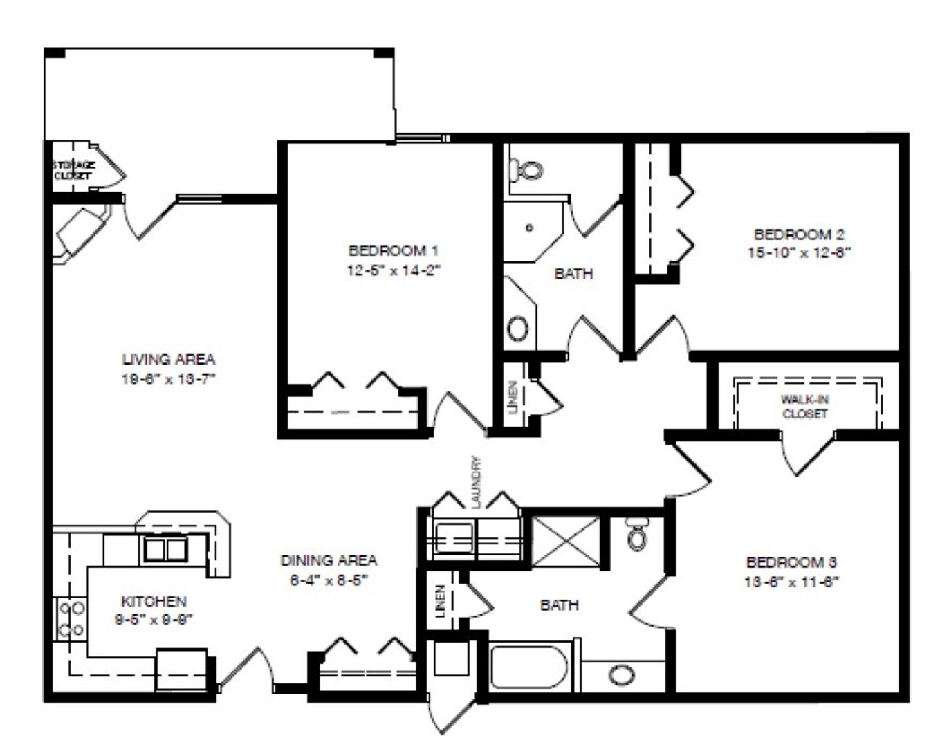This is our Venetian floorplan with three bedrooms, two bathrooms, and 1,571 square feet of living space. This floorplan offers a gourmet kitchen, large walk-in closet, full-size washer and dryer, and master bathroom suite with an over-sized soaking tub and walk-in shower.