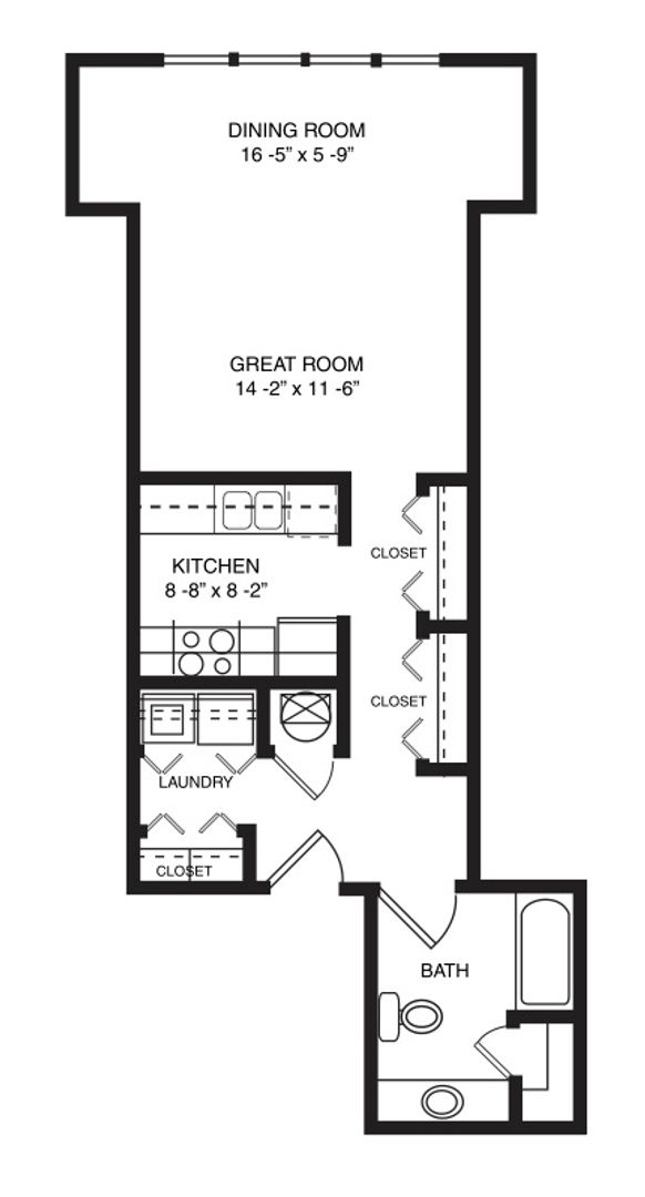 This is our Stargazer studio floorplan with one bathroom and 639 square feet of living space. This floorplan offers a washer/dryer in-unit, fully-equipped kitchen, and generous storage space. Please call a member of our friendly leasing staff for more information!