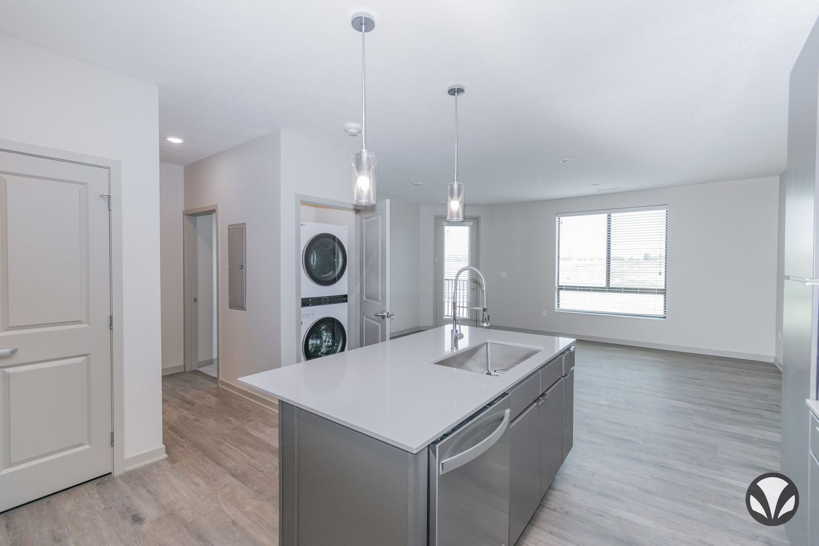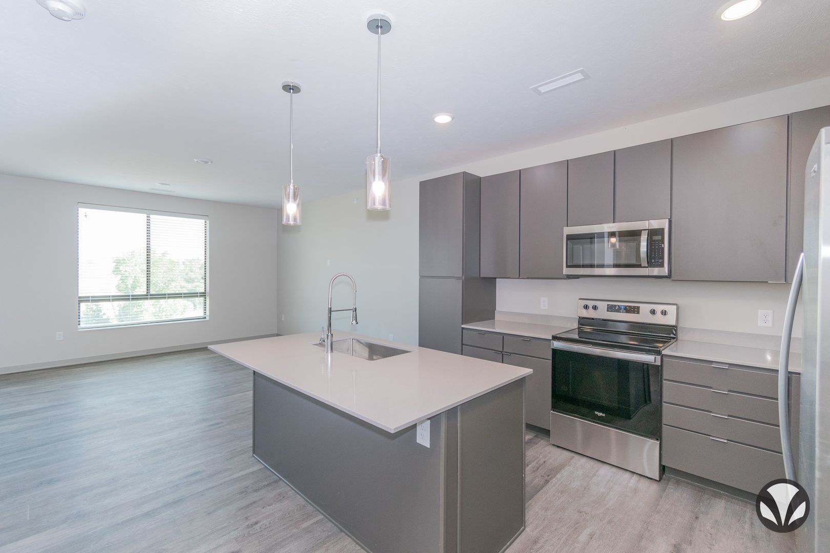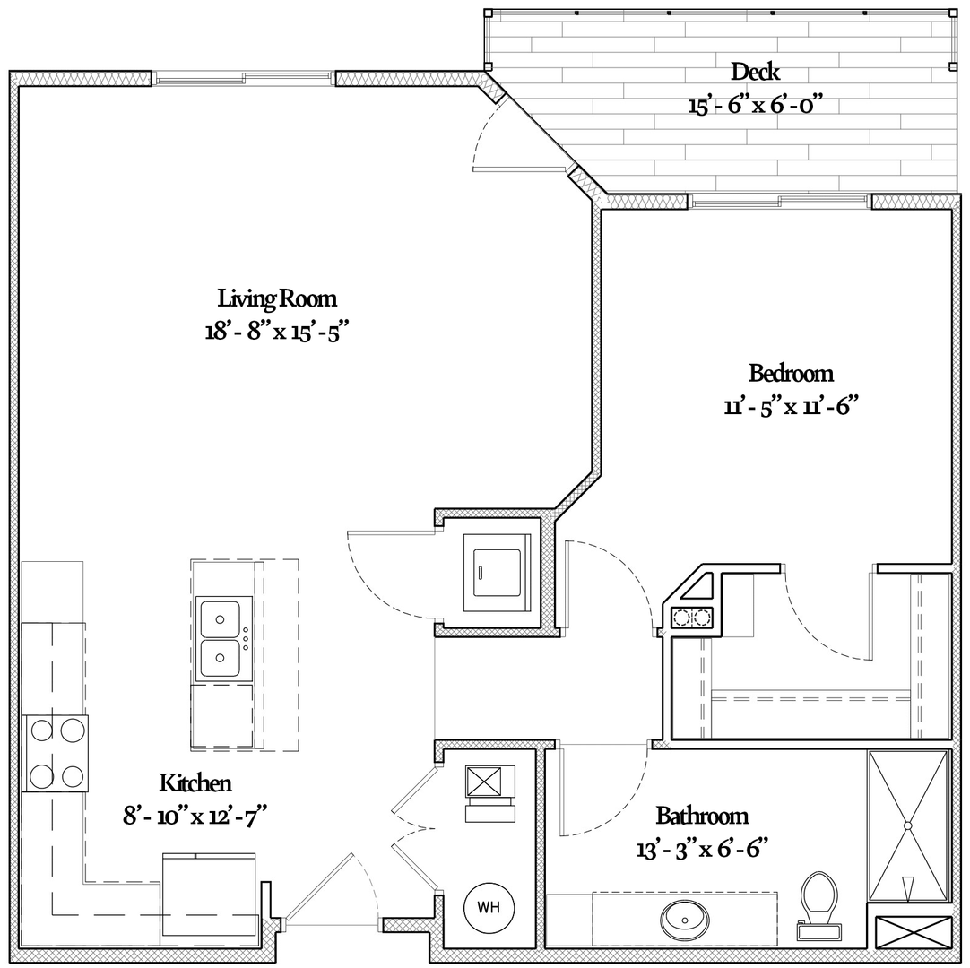 Explore our 1 bedroom Positano floorplan with 840 square feet. Relish the green spaces around you with a view from your deck. Inside, take a seat at your island to enjoy your open kitchen which comes fully equipped. Kick back in your spacious bedroom or bask in the natural light of your living room with its oversized windows. Every unit also comes with its own washer & dryer!