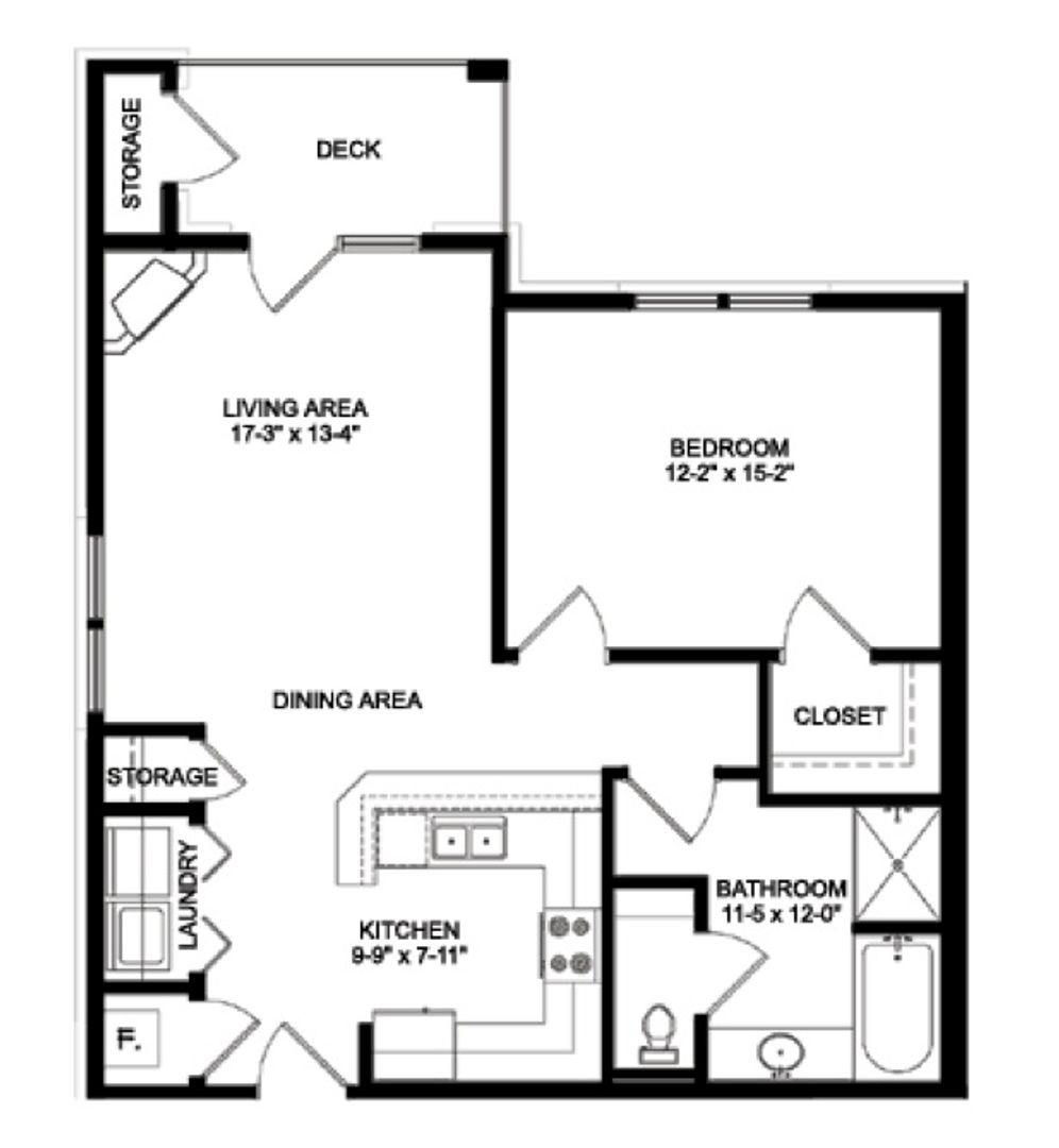 This is our Eclipse floorplan with one bedroom, one bathroom, and 798 square feet of living space. This floorplan offers spacious living areas and a fully-equipped kitchen. Please call a member of our friendly leasing staff for more information!
