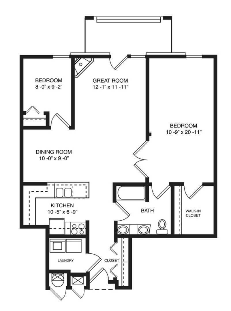 This is our Sunirse II floorplan with one bedroom, one bathroom, and 1,084 square feet of living space. This floorplan offers spacious living areas and a walk-in closet. Please call a member of our friendly leasing staff for more information!