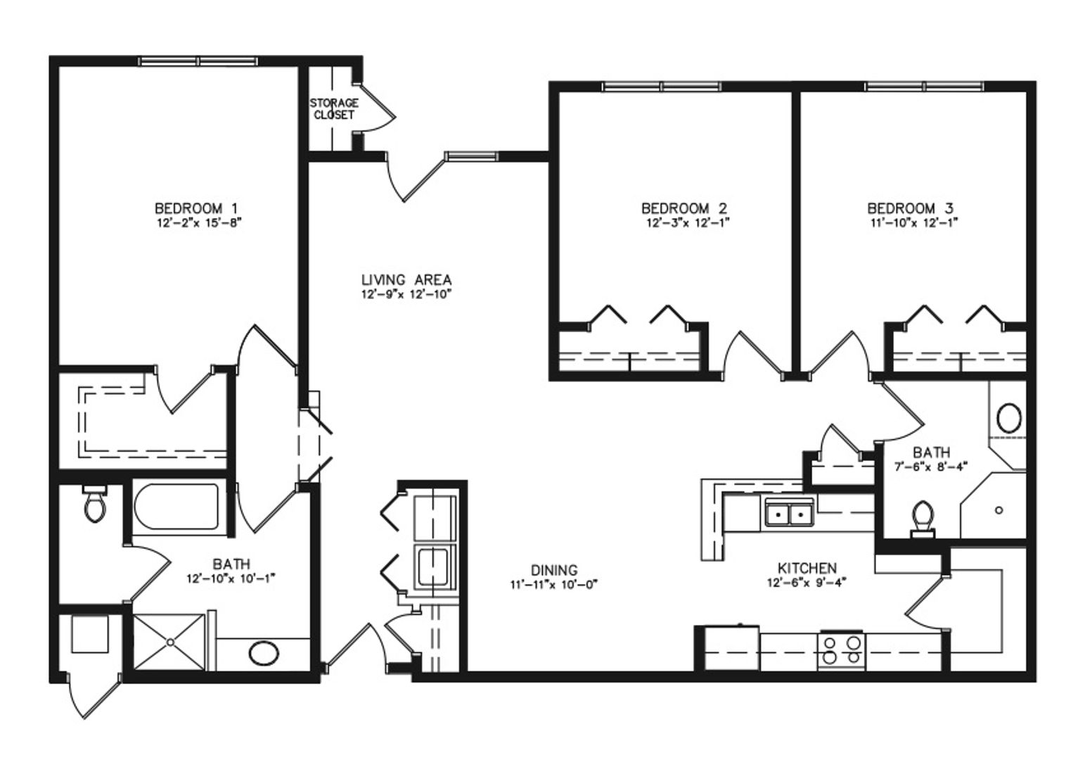 This is our Cosmopolitan floor plan with three bedrooms, two bathrooms, and 1,572 square feet of living space. This floor plan offers a washer/dryer in-unit, huge kitchen with walk in pantry, dining area with laminate flooring, master suite with soaking tub, extra storage off the balcony and much more!