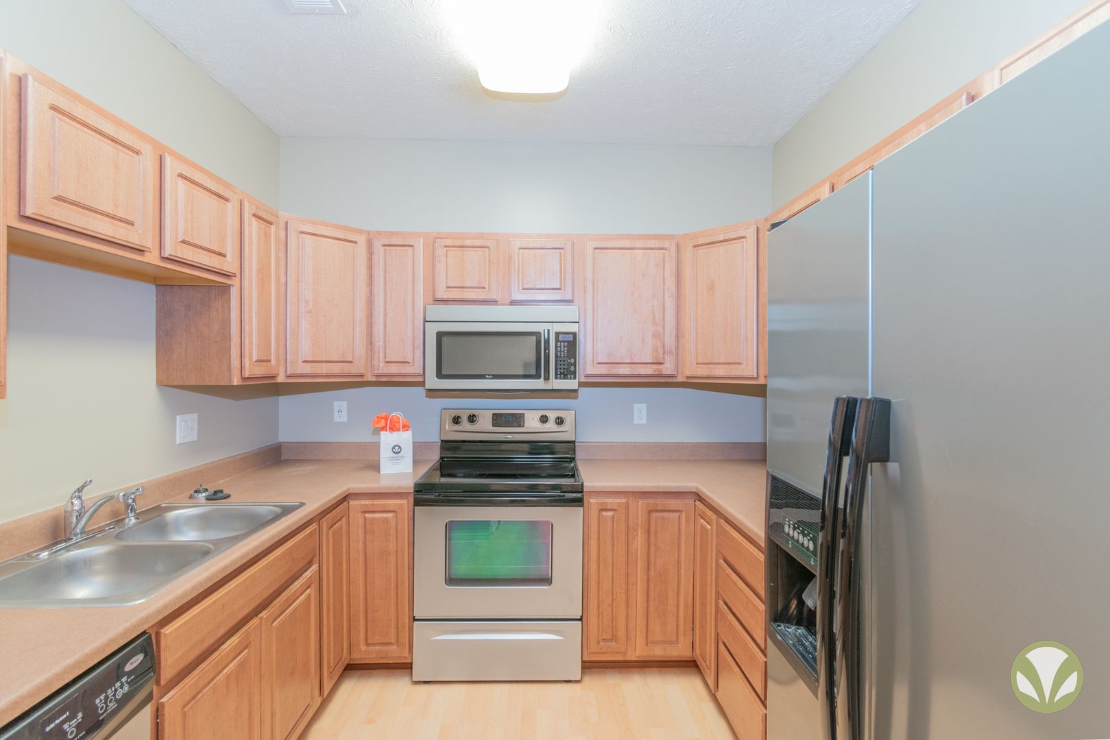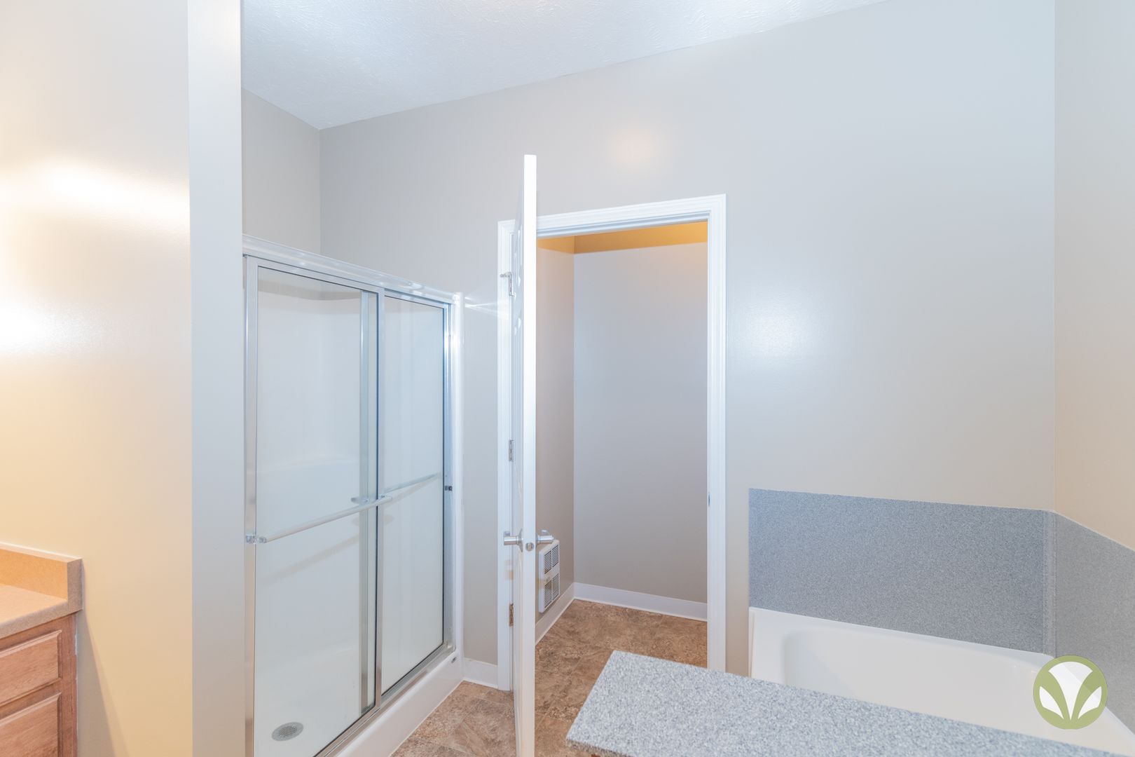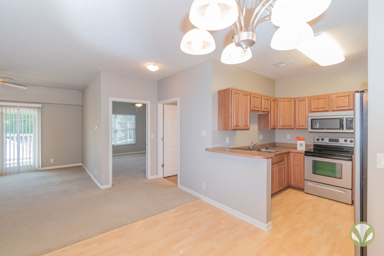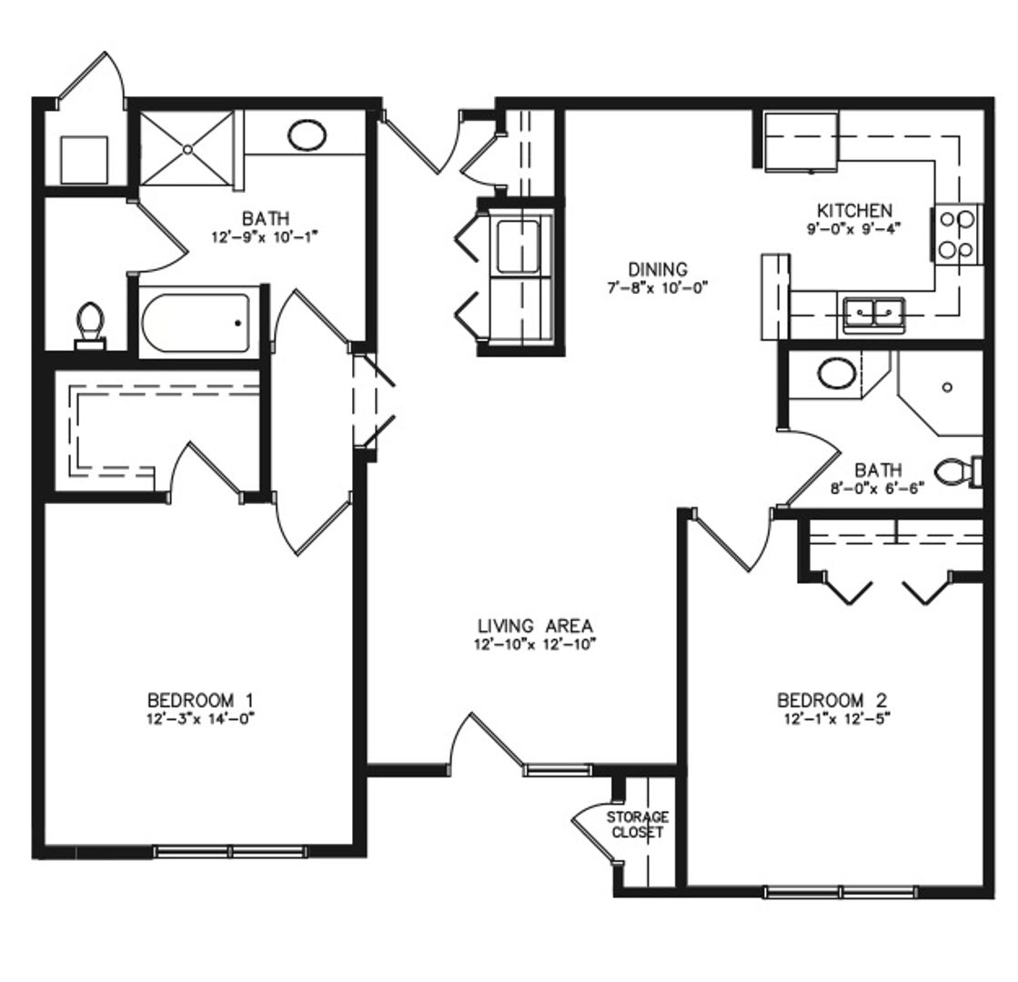 This is our Riviera floorplan with two bedrooms, two bathrooms, and 1,175 square feet of living space. This floorplan offers a fully-equipped kitchen, large walk-in closet, and a garden style-soaking tub. Please call a member of our friendly leasing staff for more information!