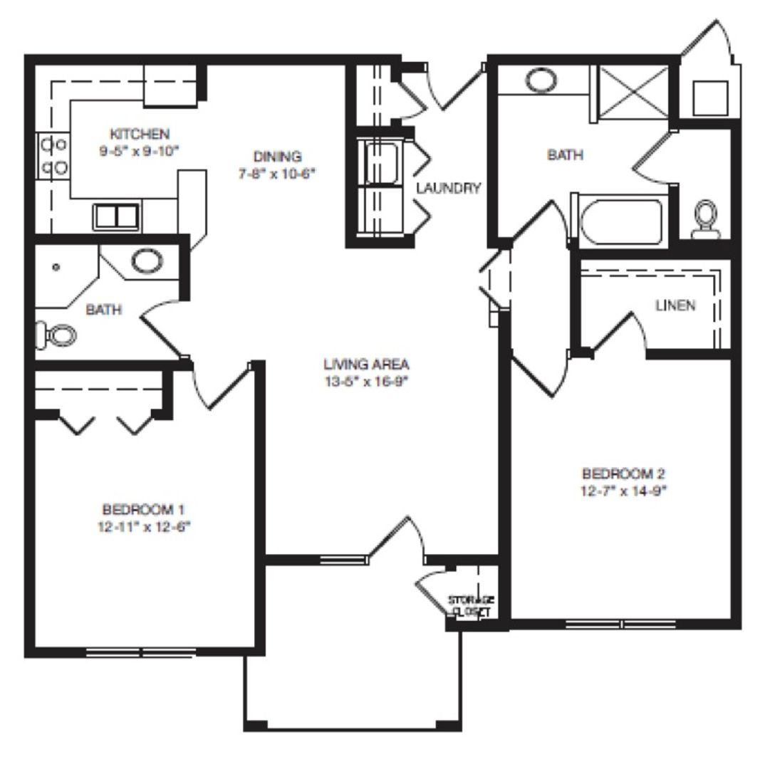 This is our Trailview Riviera floorplan with two bedrooms, two bathrooms, and 1,175 square feet of living space. This floorplan offers a washer/dryer in-unit, walk-in closet, and spacious living areas. Please call a member of our friendly leasing staff for more information!