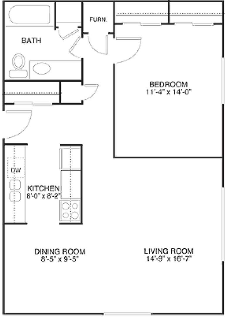 This is our Aspen II floorplan with one bedroom, one bathroom, and 835 square feet of living space. This floorplan offers generous storage space and a fully-equipped kitchen. Please call a member of our friendly leasing staff for more information!